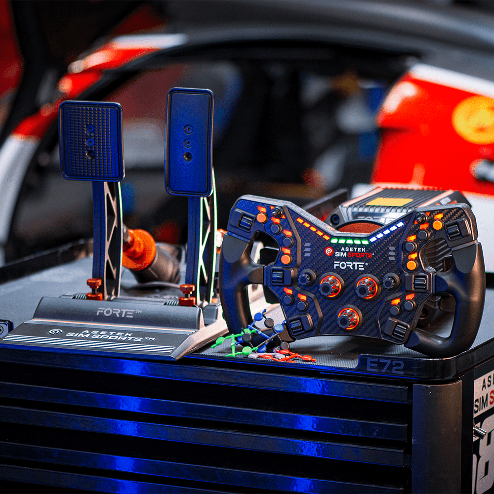 The Forte series represents a middle ground between price and advanced functionality, aimed at the dedicated hobbyist. The product range includes a powerful wheelbase with 18Nm of torque, a durable steering wheel option with a carbon fibre front plate for extra durability and responsiveness, and the Forte pedal system that offers intuitive control. This range is ideal for racers looking to improve their performance without compromising on quality and technology.