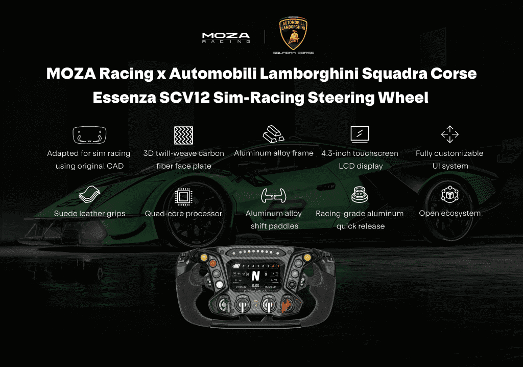 Following their collaboration that began earlier this year with the sponsorship of the Lamborghini Super Trofeo Esports tournament, MOZA is now proud to announce the launch of the Essenza SCV12 Sim Racing steering wheel to. And guys, this is not just any steering wheel! This is a Lamborghini Essenza SCV12-inspired replica designed specifically for sim racing. This steering wheel promises to bring the reality of racing to the virtual world like never before. In this article, we tell you everything you need to know about this unique collaboration and replica!