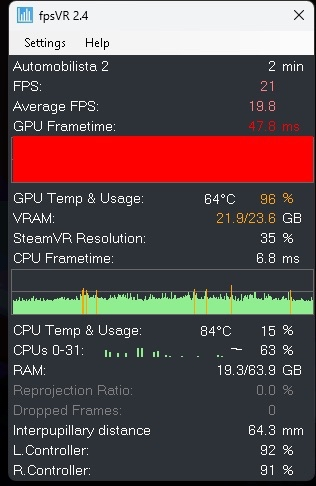 The frame rate often dropped below 30 fps, even with my Nvidia RTX 4090. And that is simply unacceptable. The GPU load was constantly near the ceiling, including VRAM. To make it even somewhat playable, I had to scale back the resolution in Pimax Play to 0.7 or 0.8. And that hurts. Because at that point, you lose a lot in sharpness, detail and the overall visual picture. And then the question automatically arises: why invest in a premium VR headset if you then have to reduce everything downscaling To get it working?