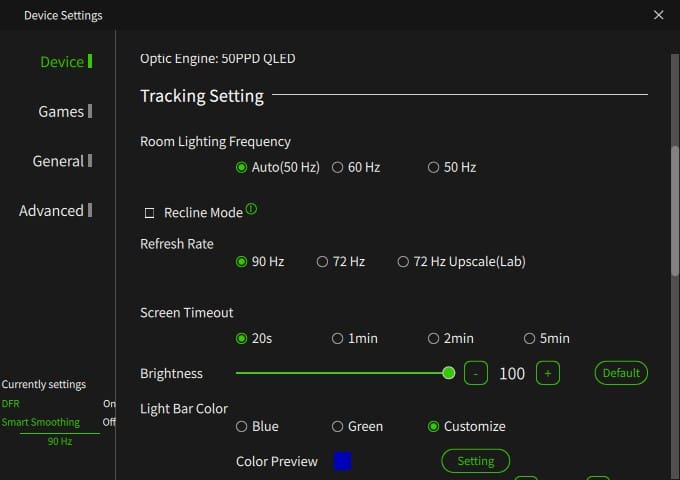 You can choose between 72Hz and 90Hz, depending on your preference or the power of your PC. Although 90Hz is really the minimum for simracing, the choice does offer flexibility. For me personally, it remains a shame that the 120Hz of the Crystal Light missing here.
