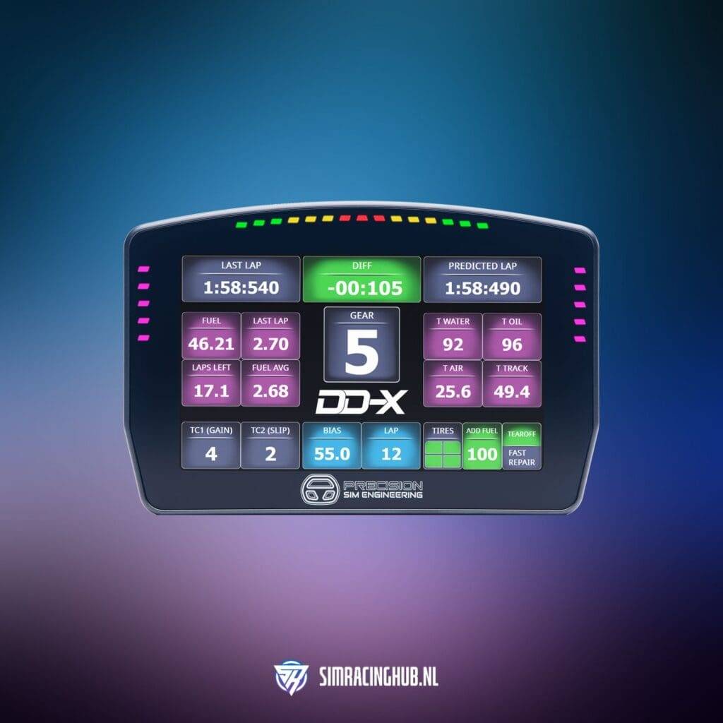 Of course, you can import any dashboard into SimHub, including the popular Lovely Dashboards work on the DD-X. Precision Sim Engineering itself also has its own DD-X dashboard, but in all honesty, it is just not that and I stay true to my own dashboards that I use a lot.