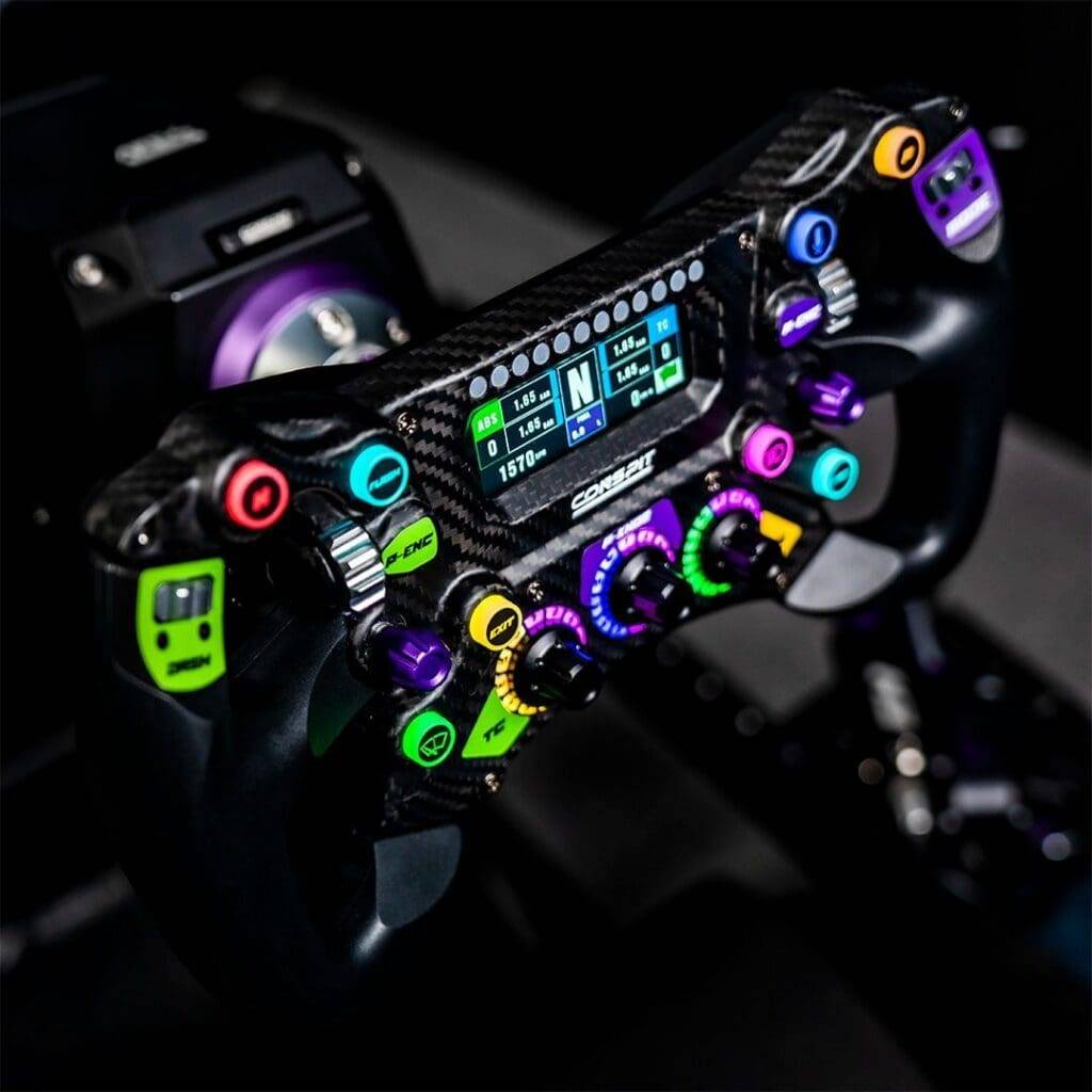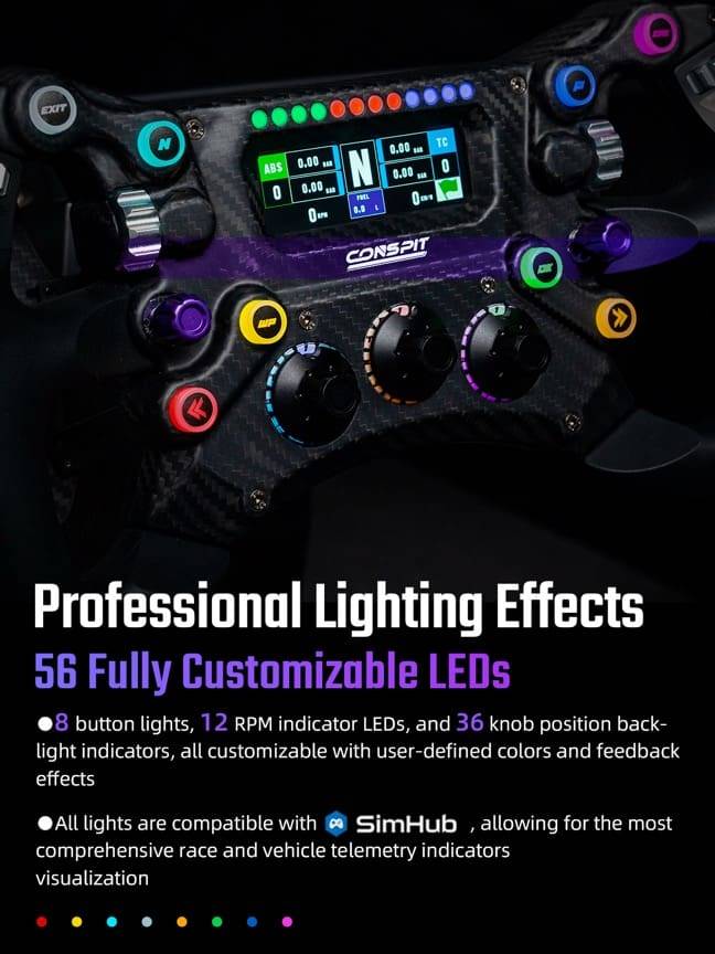 Le Conspit 300GT est un volant professionnel léger de 300 mm de diamètre conçu pour les courses de GT et d'endurance. Ce volant combine des matériaux de haute qualité, tels que la fibre de carbone T-300 et l'aluminium usiné CNC, avec des fonctionnalités étendues, notamment 110 entrées programmables et un écran couleur intégré. Son prix compétitif et sa large compatibilité font de ce volant un choix intéressant pour les pilotes de course simulés sérieux.